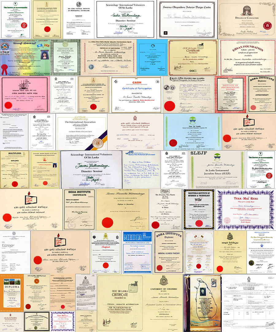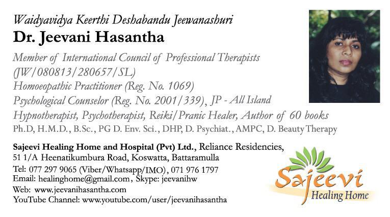 She has a doctorate on Homeopathy from the British Institute of Homeopathy(HMD), Bio science degree from Peradeniya Campus, Post graduate diploma on Enviornmental science and several diplomas on hypnotherapy psychotherapy counseling psychology NLP beauty therapy trauma counseling life coaching and Reiki/Pranic Healing. She practices for more than 21 years curing thousands of difficult dying patients in a very short time using her treatments and therapies. People come from all over the world seeing her Tv programs and by word of mouth. She is using this website to treat her patients online hereafter due to the pandemic situation in the country and all over the world as well.